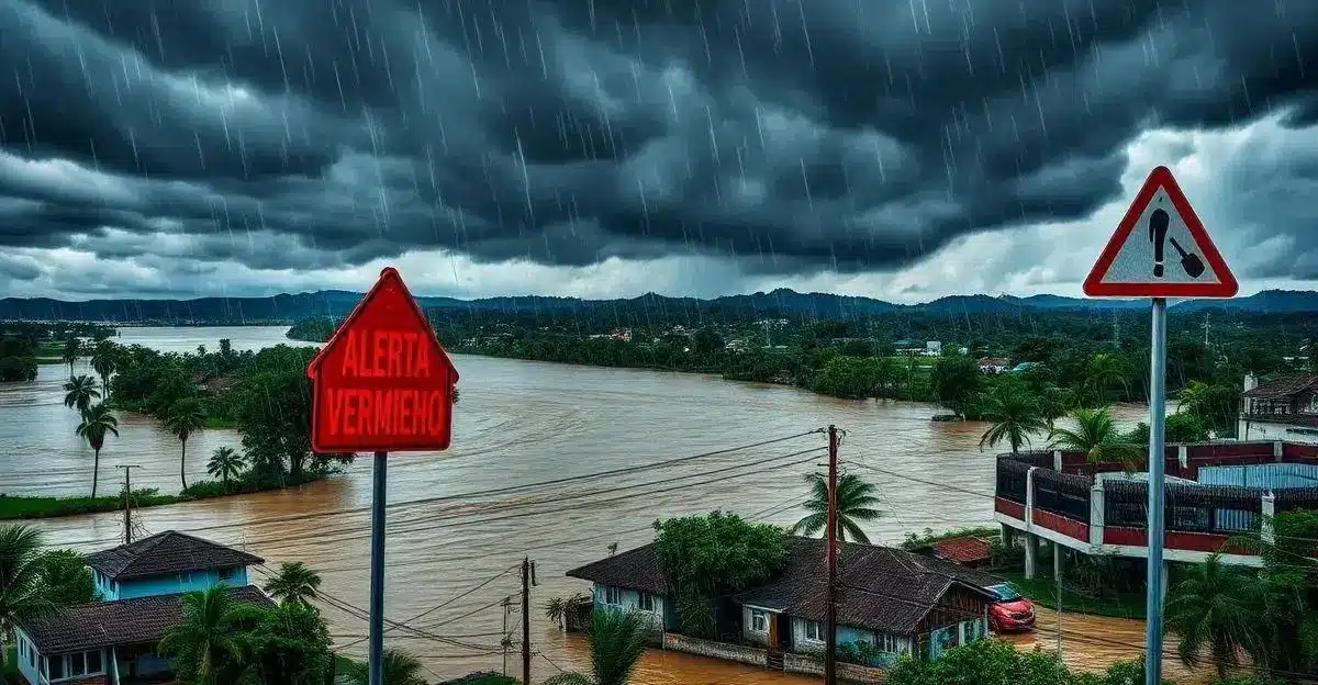 O alerta vermelho indica um ‘Grande Perigo’ devido a chuvas intensas, com risco de grandes danos e acidentes.