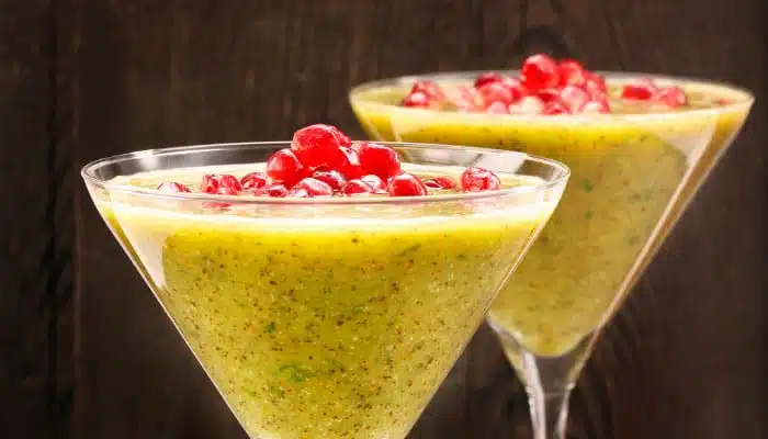 - Sirva em taças de Martini (como na figura), além disso para enfeitar você poderá usar um punhado de sementes da Romã como mostra a figura e ou uma rodela de Kiwi para enfeitar.